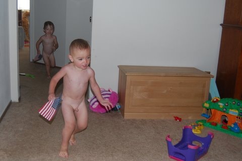 On the actual 4th I had to give the kids a bath mid day for some reason that escapes my mind (Mari getting into poo again, Ben peeing all over himself, and an extremely messy food episode are all real possibilities). It is a tradition in our home post bath to do do naked laps around the house. We normally give them a quick dry with the towel and then shout "We've got a runner!" and let them lose. The kids love it. Ben runs around squealing and holding his wee and Mari joins in with jumps, jogs, and screams of her own. I can appreciate the joy they get from this. On one occasion I joined them in their fun (good luck getting that image out of your head) and it was quite liberating. Anyhoo- in spirit of the 4th I gave them flags to run with. This was easy enough to reenact.